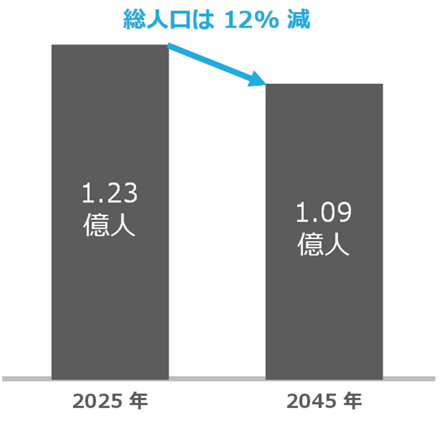 ãŸãå°æ¥æšèšäººå£ïŒ2020幎åœå¢èª¿æ»ã2023å¹Žçµæå ¬è¡šïŒã«ããã°ã2025幎ãã2045幎ã®20幎ã®éã«ãæ¥æ¬ã®ç·äººå£ã¯çŽ12%æžããšèšãããŠããŸãã