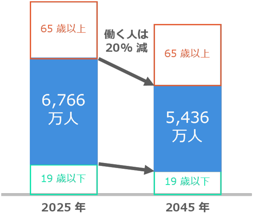 äžæ¹ã§ã20 ~ 65 æ³ãšããåã人ãã¡ã®äººå£ã¯ 20% æžããŸãããããã