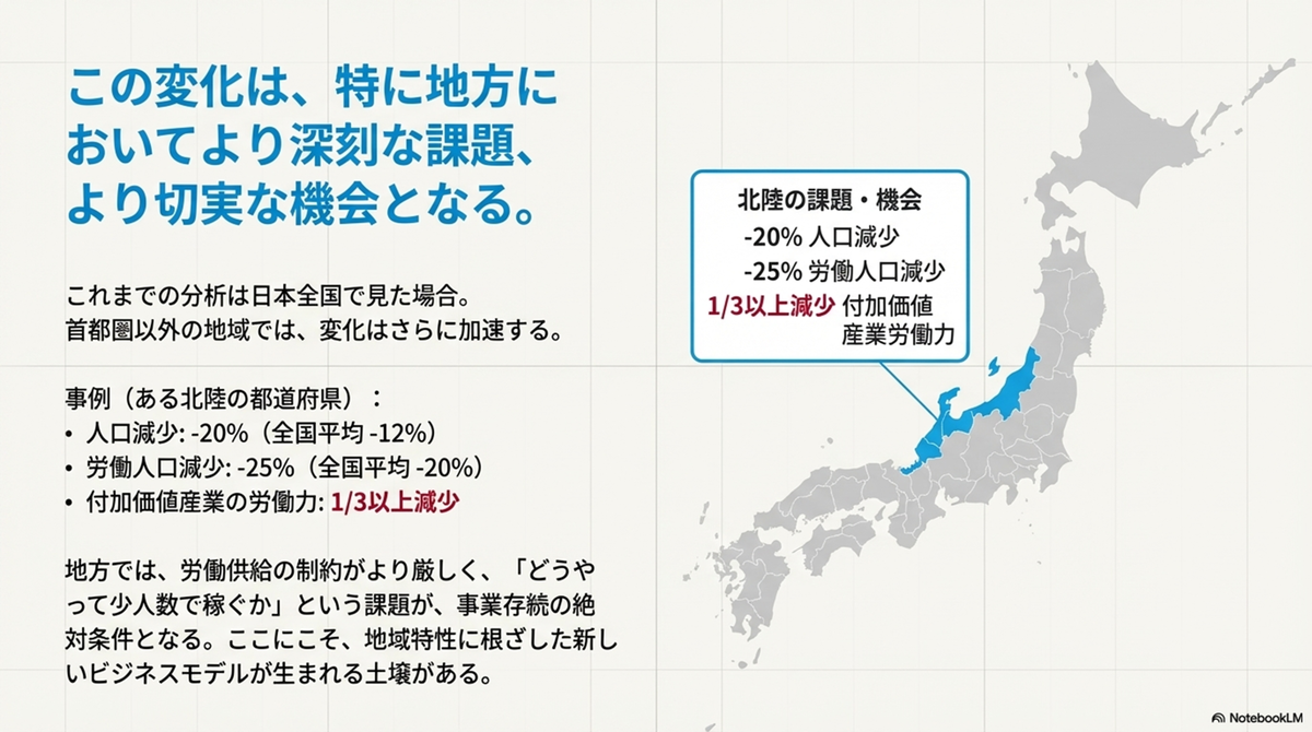 ãšããåéžã®éœéåºçã§èŠãŠã¿ããšã人å£ã¯12%ã§ã¯ãªã20%æžã§ã20æ³ãã65æ³ã®äººæ°ã¯ 25% æžãšãªããŸãããã®çµæãä»å 䟡å€ç£æ¥ã«å²ãã人㯠1/3 ä»¥äžæžããšãã£ã圢ã§ããã